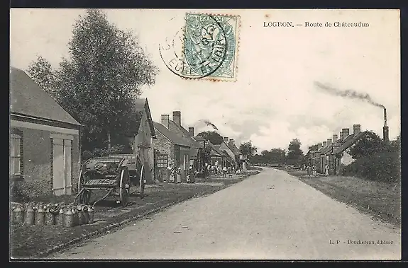 AK Logron, Route de Châteaudun avec charrette et maisons alignées