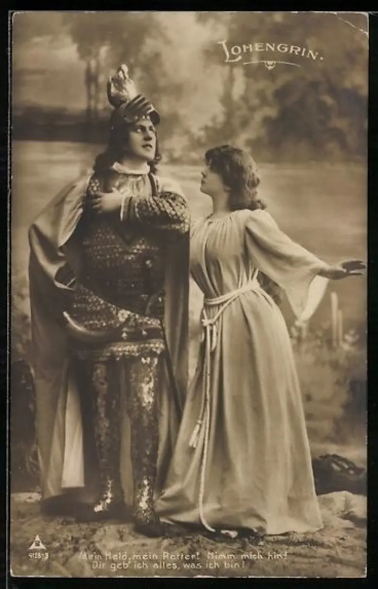 AK Lohengrin, Parsival in Rüstung mit einer Dame