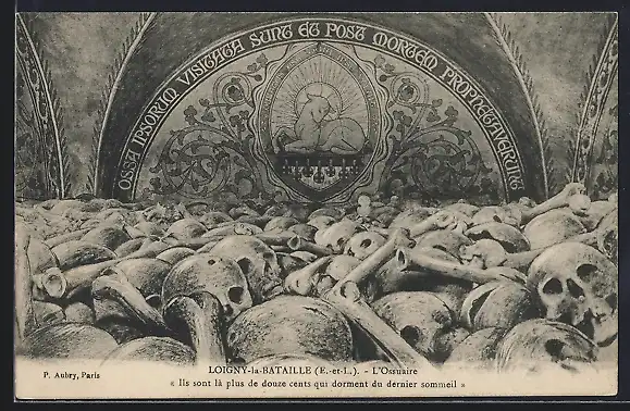 AK Loigny-la-Bataille, L`ossuaire avec plus de deux cents crânes et ossements en dernier sommeil