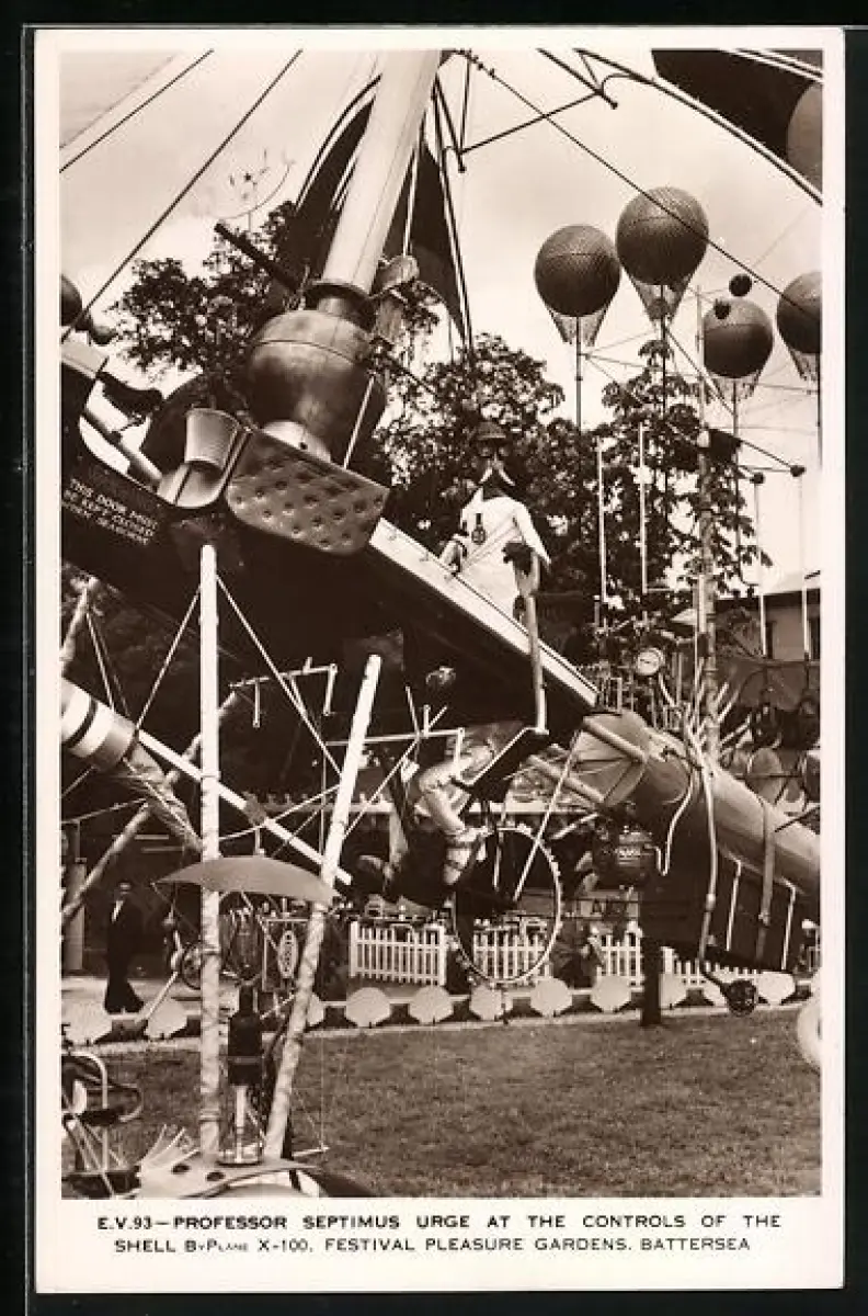 AK London-Battersea, Professor Septimus urge at the controls of the Shell BvPlane X-100 Festival Gardens