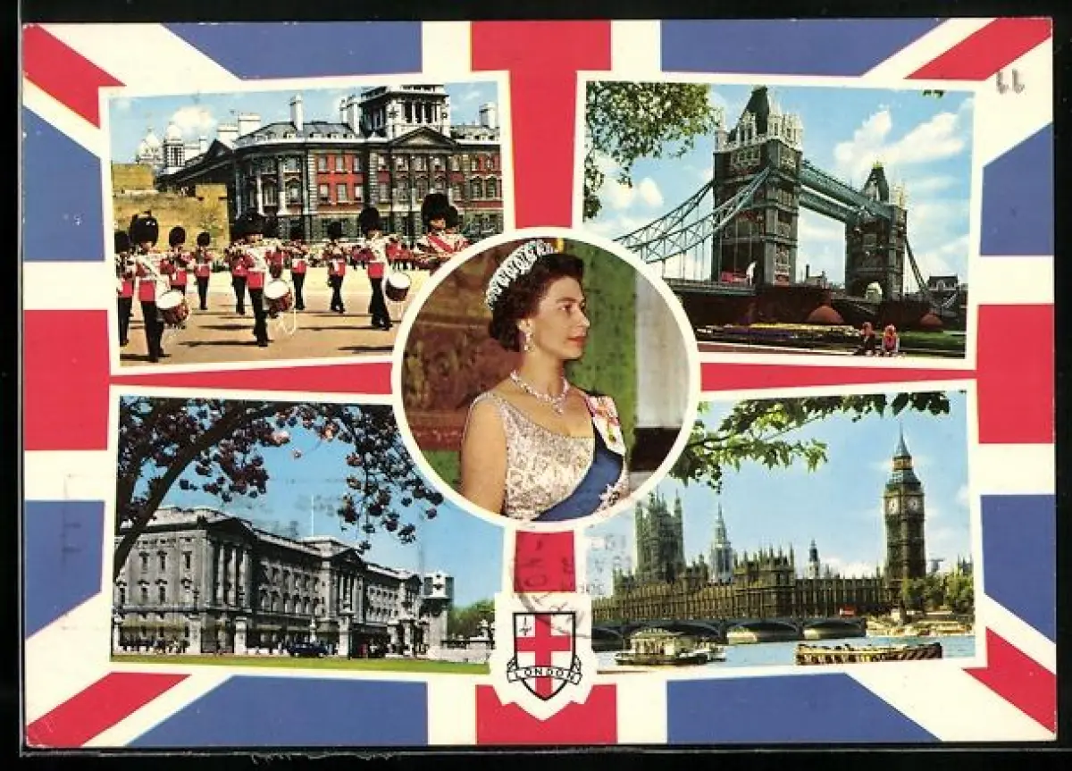 AK London, Königin Elizabeth II. von England, Big Ben, Tower Bridge, Schloss, Leibgarde