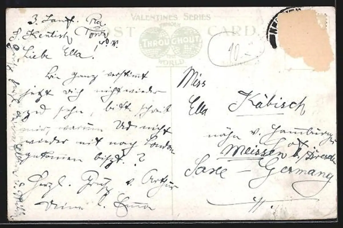 alte Ansichtskarte, gelaufen, Briefmarke entfernt, rückseitig Oberflächenschaden, Abriebspur unten li., guter Zustand