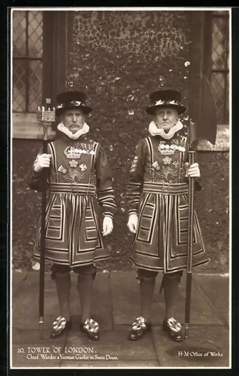 AK London, Tower of London, Chef Warder & Yeoman Gaoler in State Dress, Britische Soldaten