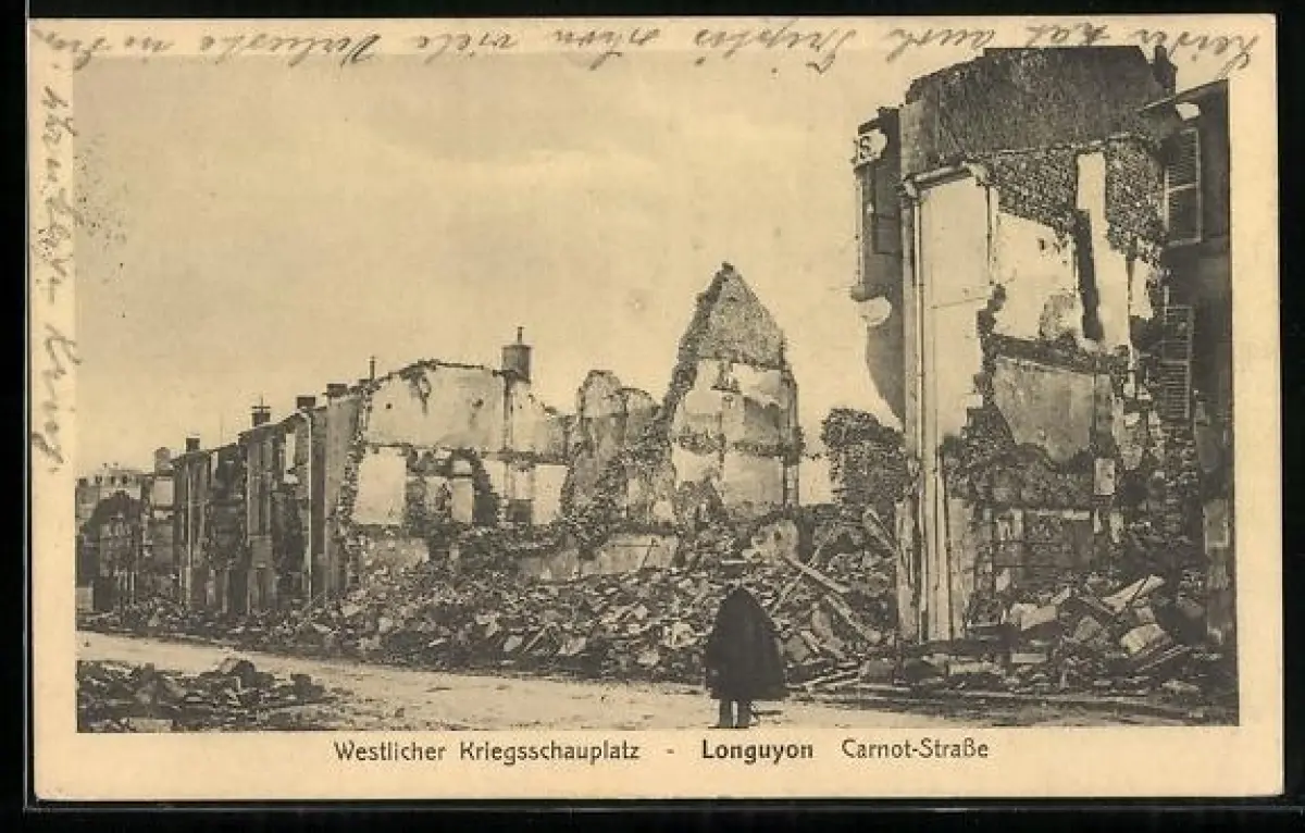 AK Longuyon, Carnot-Strasse mit Kriegsruinen
