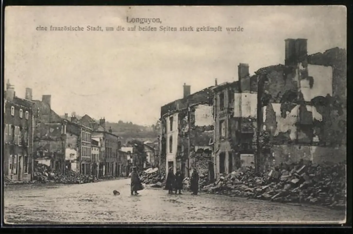 AK Longuyon, Strassenpartie mit Kriegsruinen und Soldatengruppe
