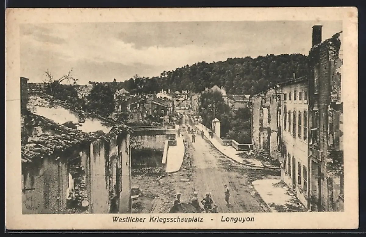 AK Longuyon, Westlicher Kriegsschauplatz, Strassenpartie mit zerstörten Häusern und Soldaten