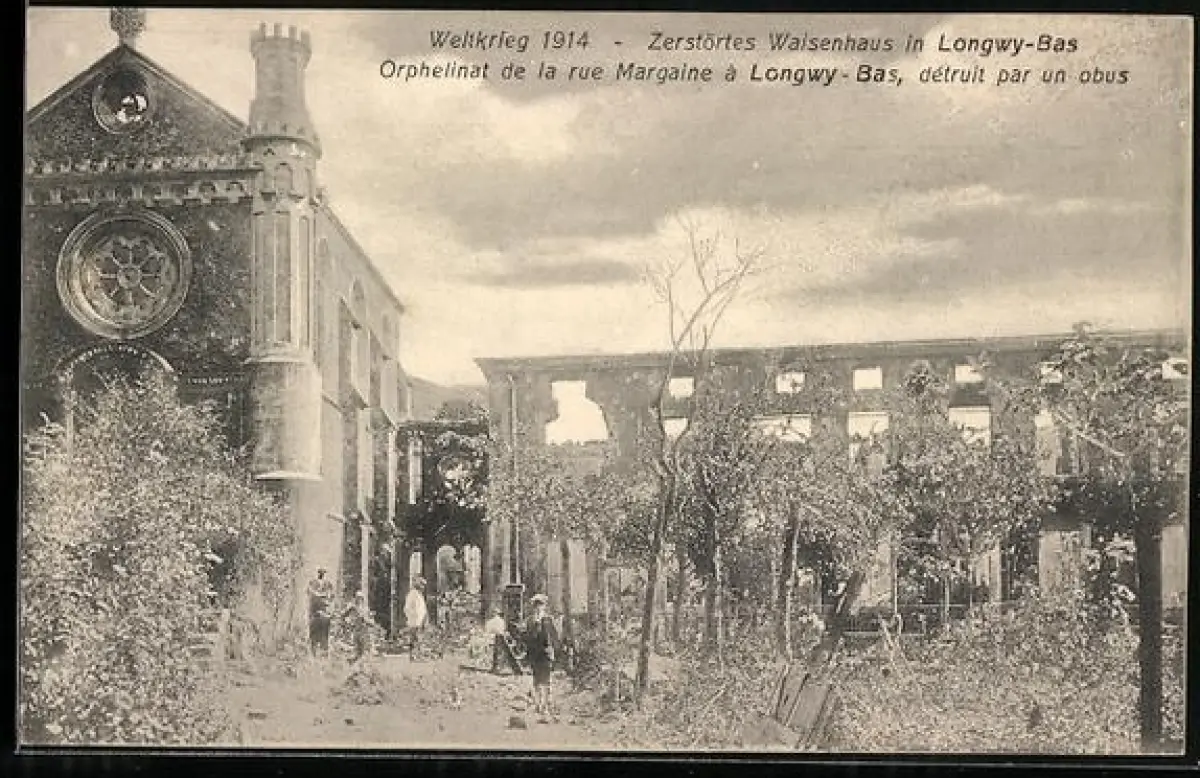 AK Longwy-Bas, Orphelinat de la rue Margaine, détruit par un obus, Weltkrieg 1914