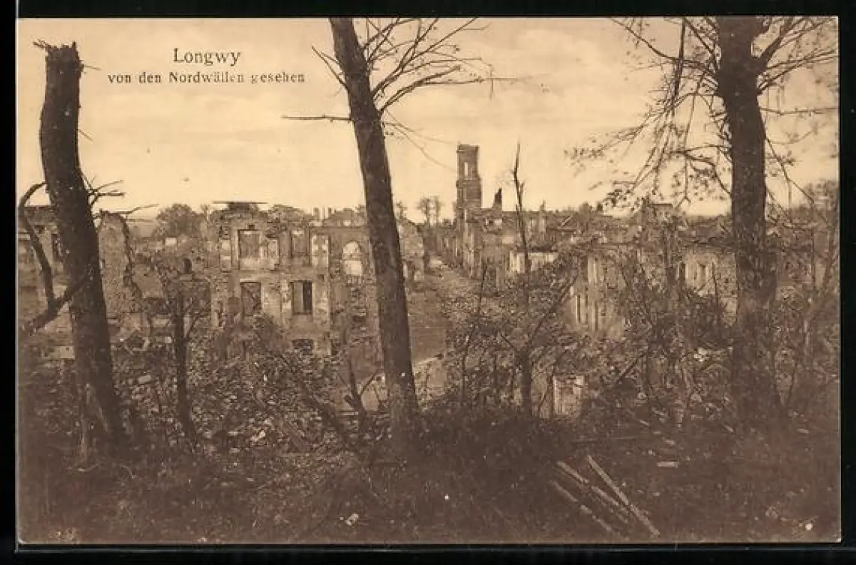 AK Longwy, Blick von dem Wald auf zerstörte Häuser