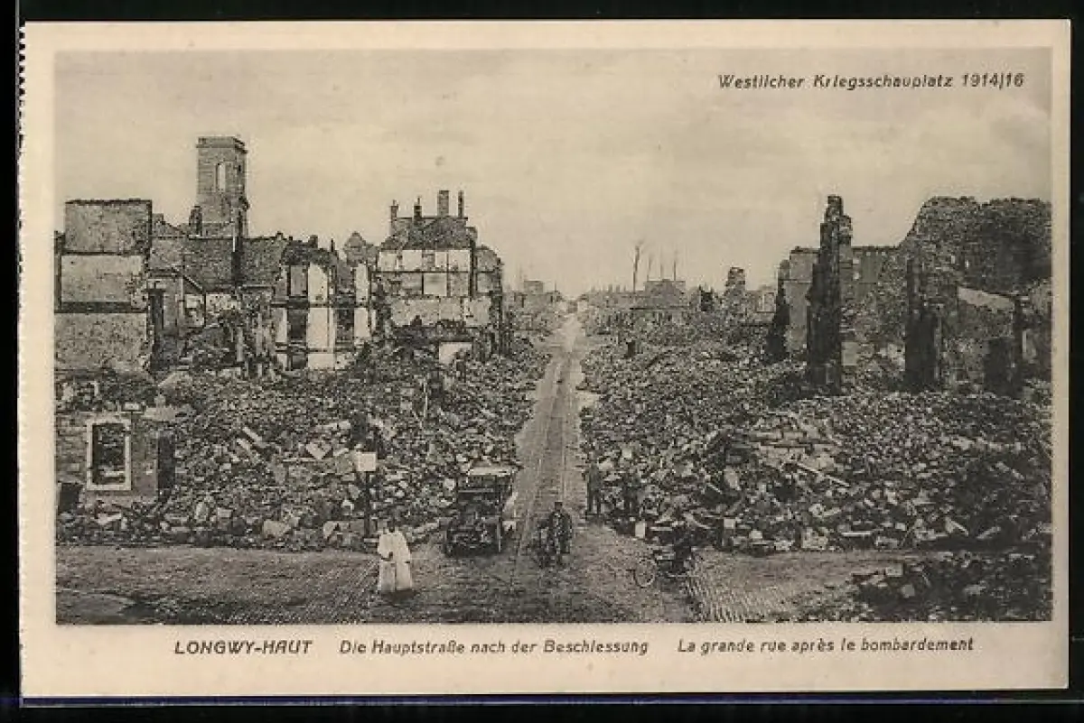 AK Longwy-Haut, Hauptstrasse nach der Beschiessung, Westlicher Kriegsschauplatz 1914/16