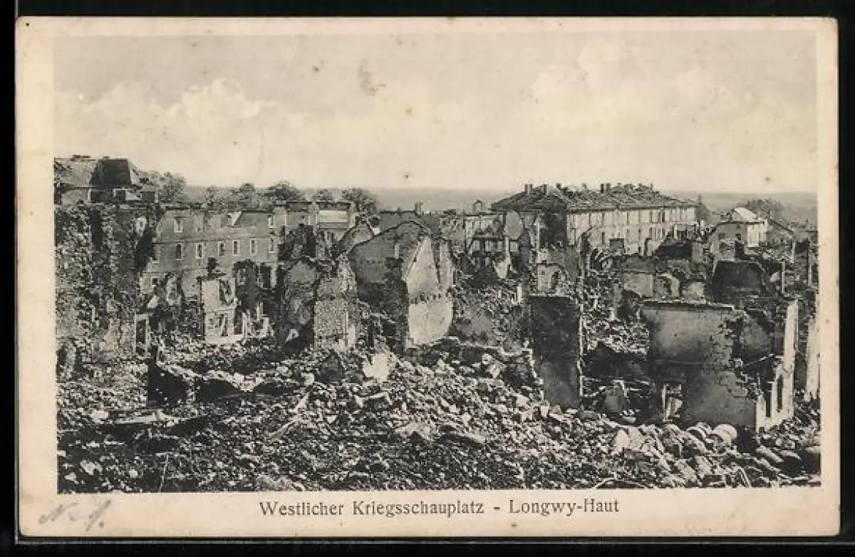 AK Longwy-Haut, Westlicher Kriegsschauplatz, Ortspartie in Trümmern