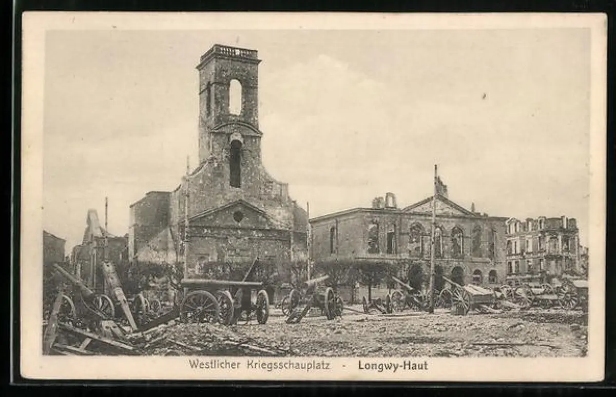 AK Longwy-Haut, Westlicher Kriegsschauplatz, Strassenpartie in Trümmern mit Kanonen