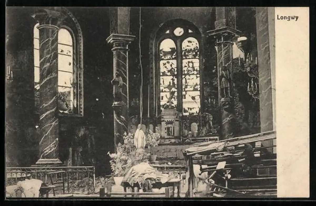 AK Longwy, Kircheninneres mit Kriegsschäden