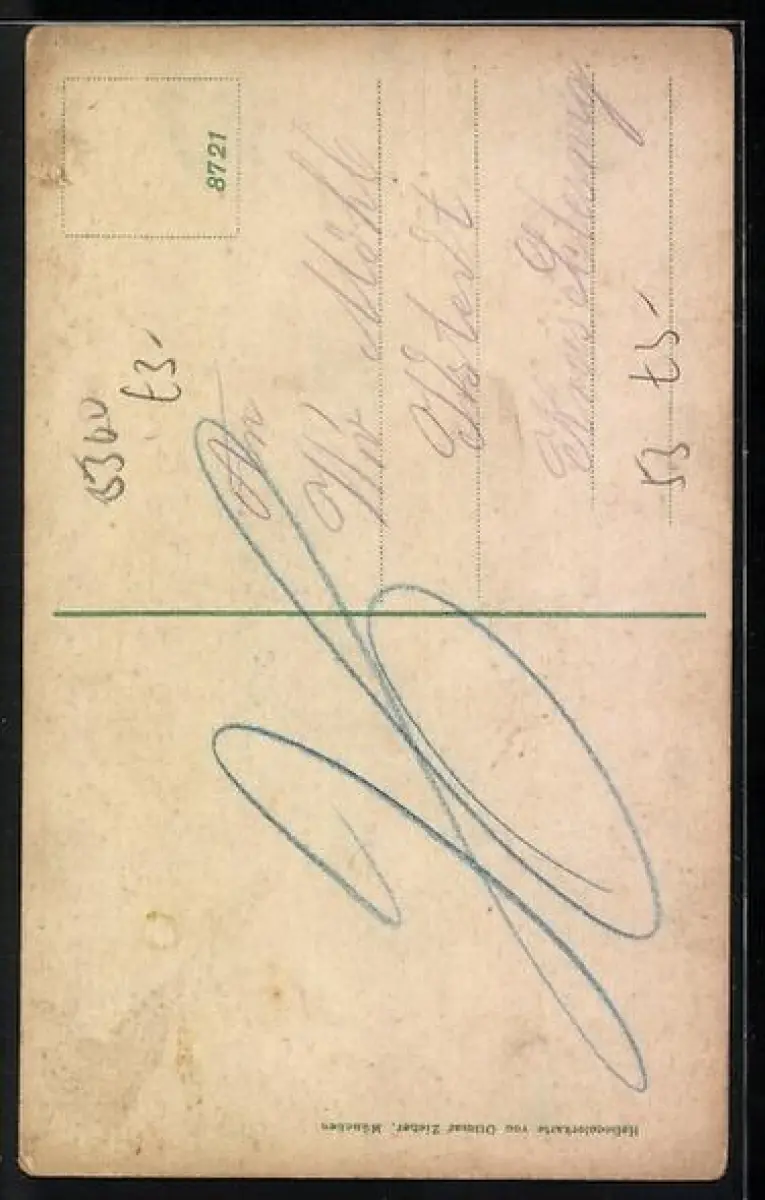 Personenbezogene Daten auf der Rückseite der Karte wurden durch blauen Textmarker unkenntlich gemacht. Die blauen Stellen sind auf die Vorderseite durchgeweicht und wirken sich negativ auf das Postkartenfoto aus