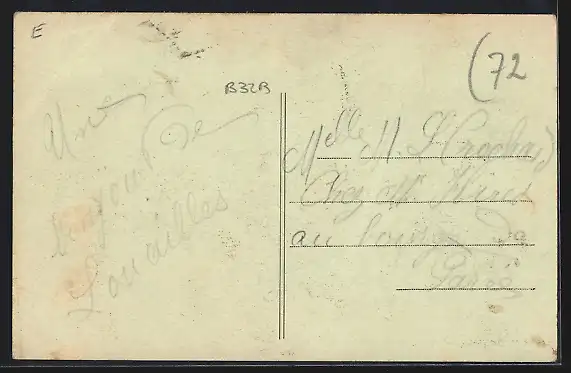 Personenbezogene Daten auf der Rückseite der Karte wurden durch blauen Textmarker unkenntlich gemacht. Die blauen Stellen sind auf die Vorderseite durchgeweicht und wirken sich negativ auf das Postkartenfoto aus