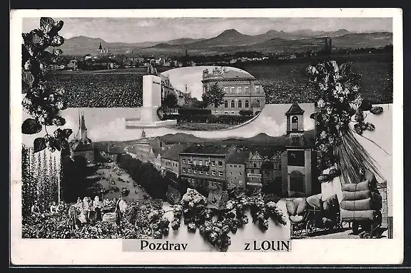 AK Louny, Strassenpartie von oben, Denkmal, Ortsanorama