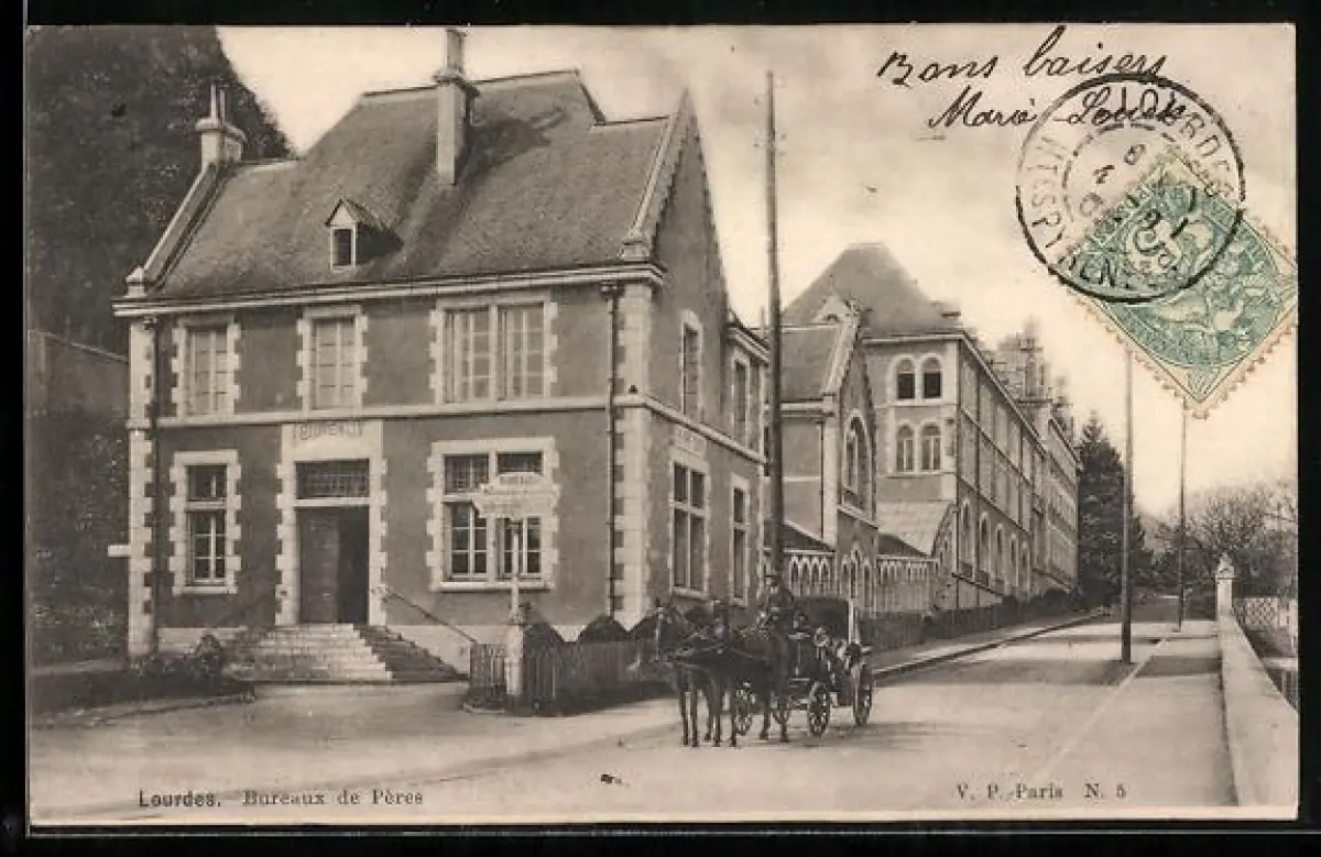 AK Lourdes, Bureaux de Pères avec calèche devant le bâtiment