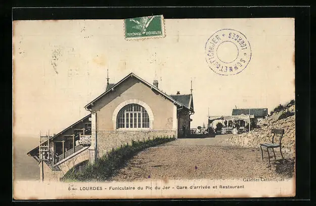 AK Lourdes, Funiculaire du Pic du Jer - Gare d`arrivèe et Restaurant, Bergbahn