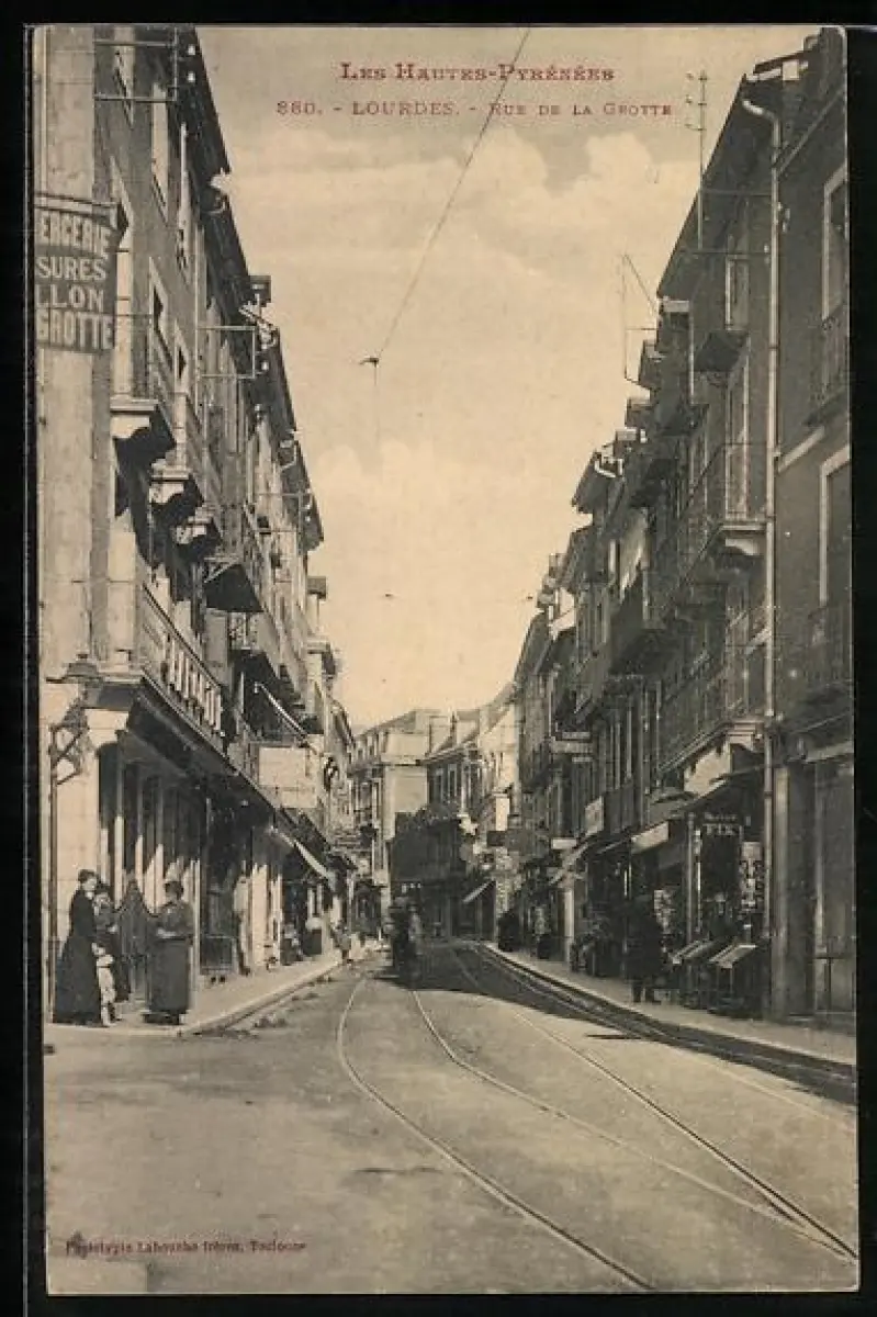 AK Lourdes /Hautes-Pyrénées, Vue de la Grotte avec tramway dans la rue animée