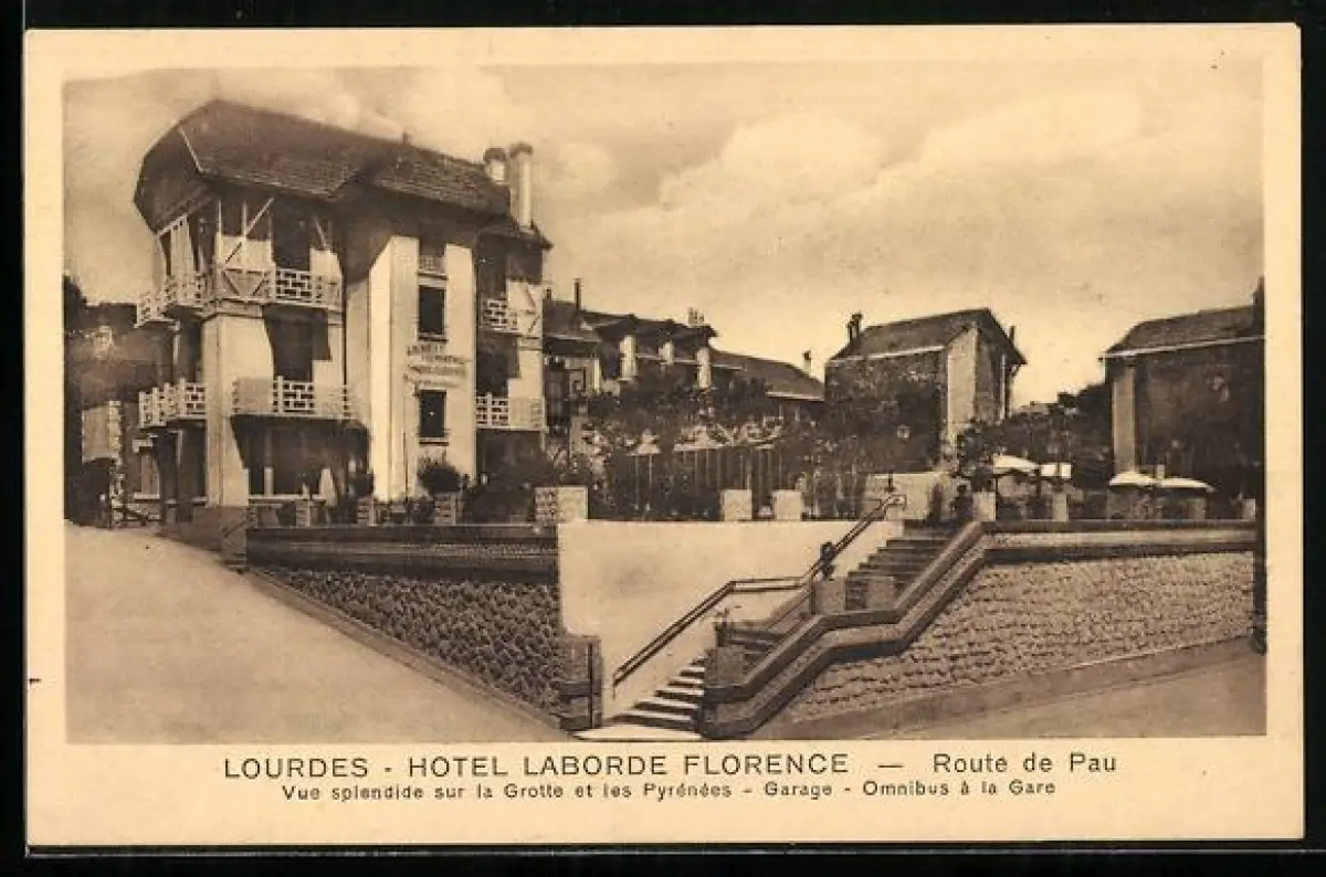 AK Lourdes, Hôtel Laborde Florence, Route de Pau, vue splendide sur la Grotte et les Pyrénées