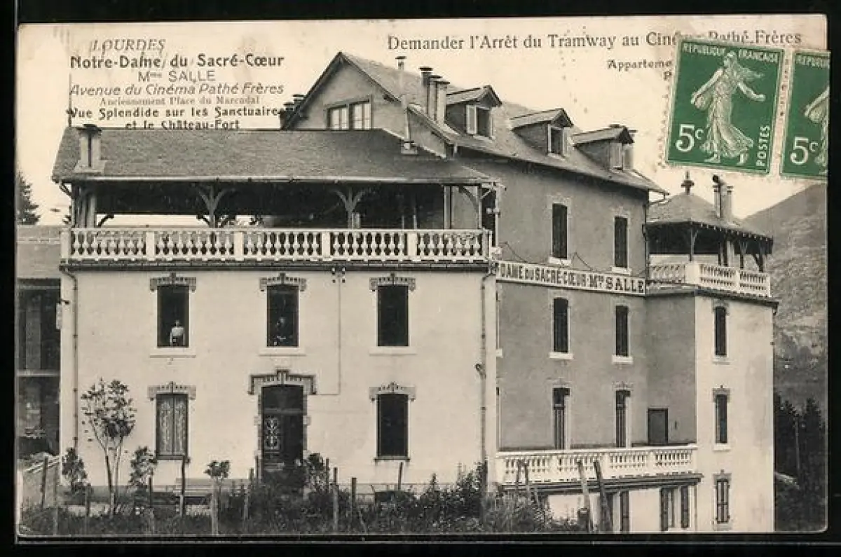 AK Lourdes, Notre-Dame du Sacré-Coeur, Cinéma Pathé Frères et arrêt du tramway