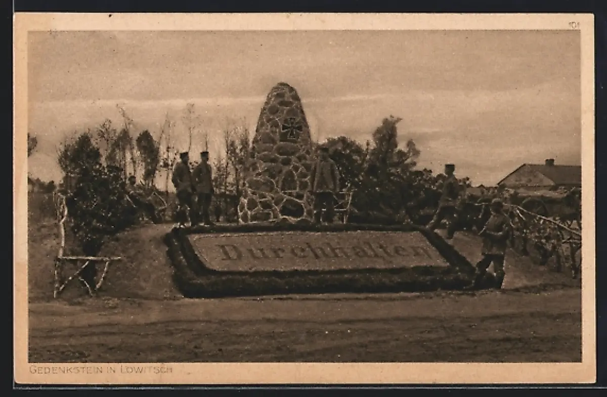 AK Lowitsch, Soldaten am Gedenkstein mit Schrift: Durchhalten, Eisernes Kreuz