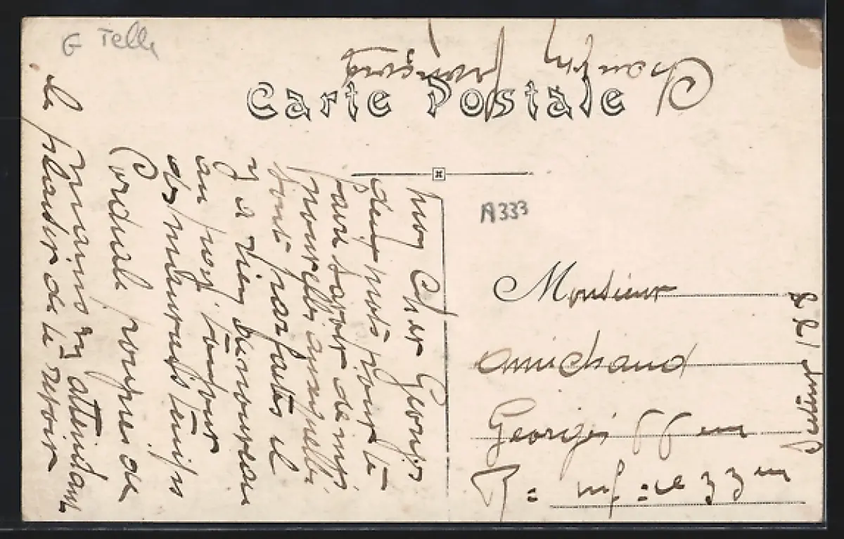 Personenbezogene Daten auf der Rückseite der Karte wurden durch blauen Textmarker unkenntlich gemacht. Die blauen Stellen sind auf die Vorderseite durchgeweicht und wirken sich negativ auf das Postkartenfoto aus