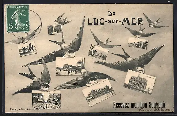 AK Luc-sur-Mer, Collage de vues avec hirondelles et bâtiments emblématiques