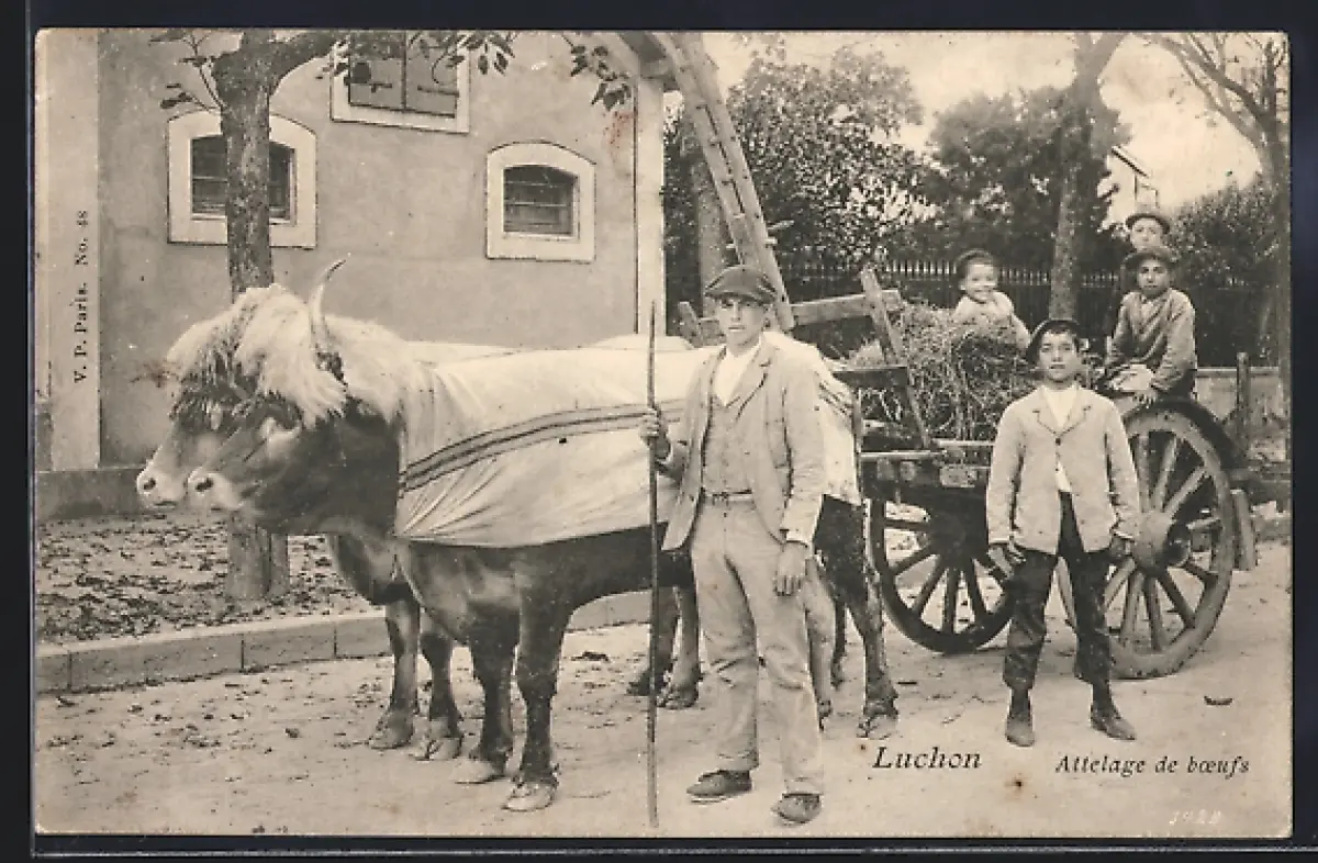 AK Luchon, Attelage de boeufs devant une maison avec des enfants sur la charrette
