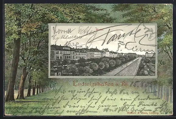 AK Ludwigshafen a. Rh., Markt aus der Vogelschau, Passepartout mit Wald
