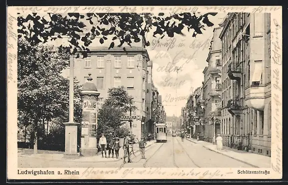 AK Ludwigshafen a. Rh., Strassenbahn und Litfasssäule in der Schützenstrasse