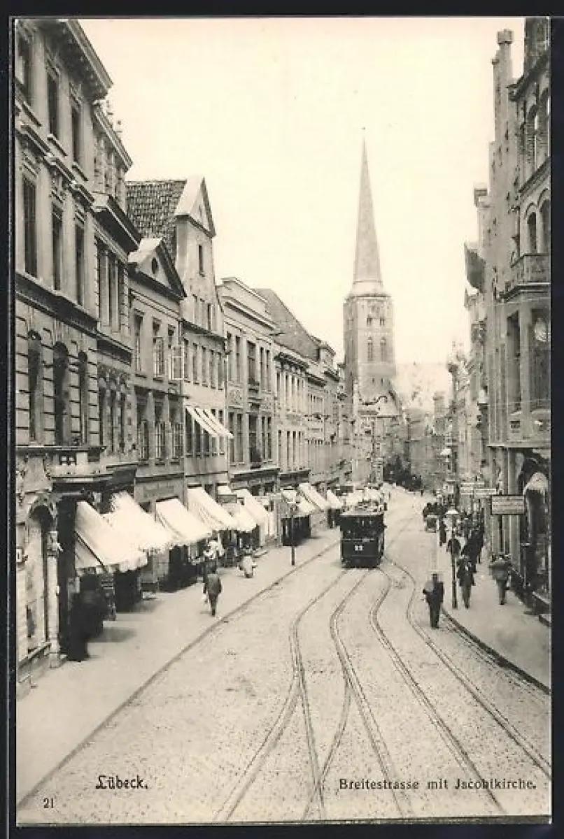 AK Lübeck, Breitestrasse mit Jacobikirche, Strassenbahn