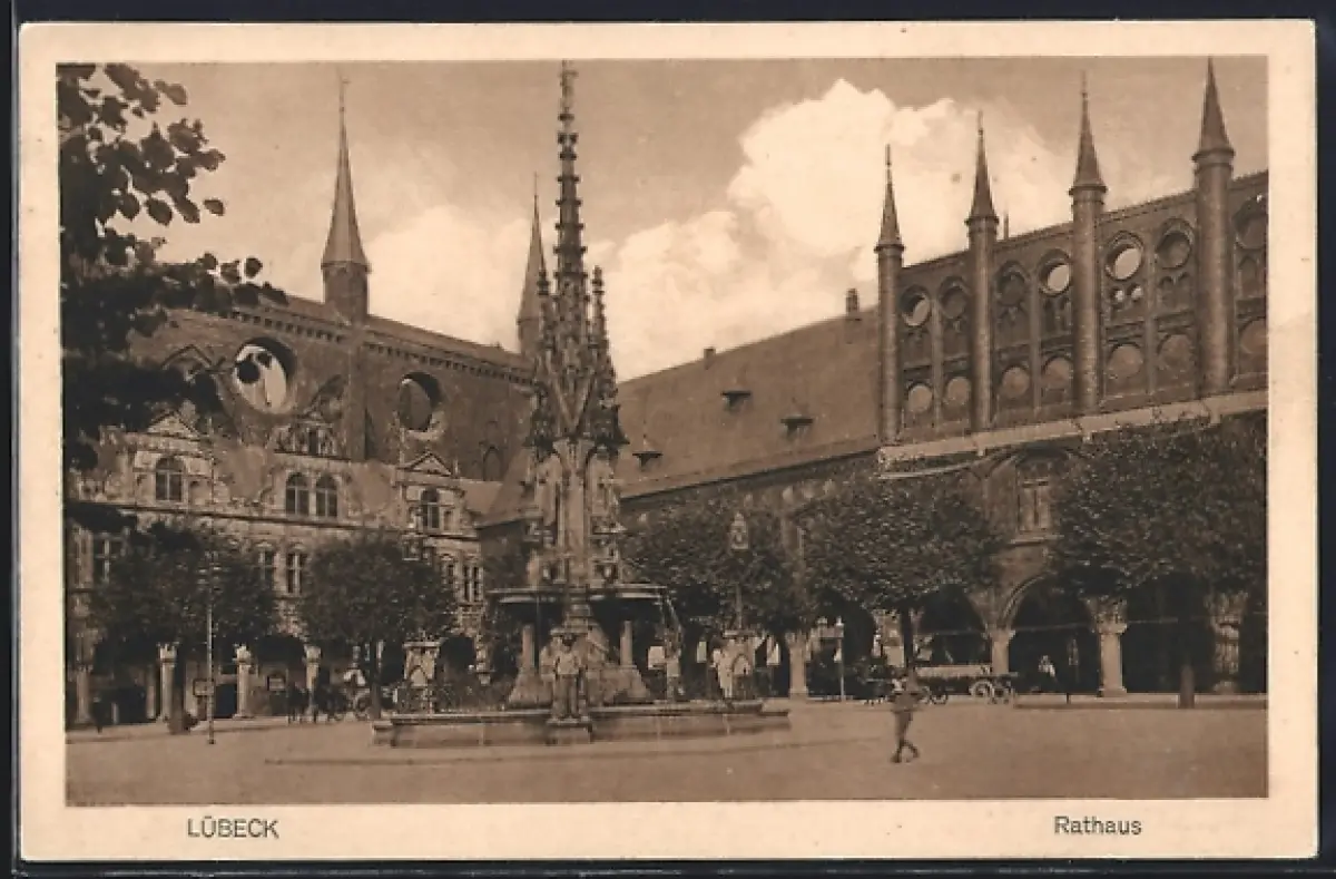 AK Lübeck, Das Rathaus mit Brunnen