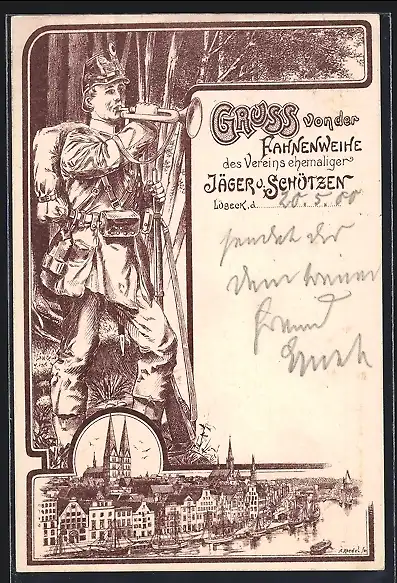 AK Lübeck, Fahnenweihe des Vereins ehem. Jäger & Schützen, Soldat mit Trompete