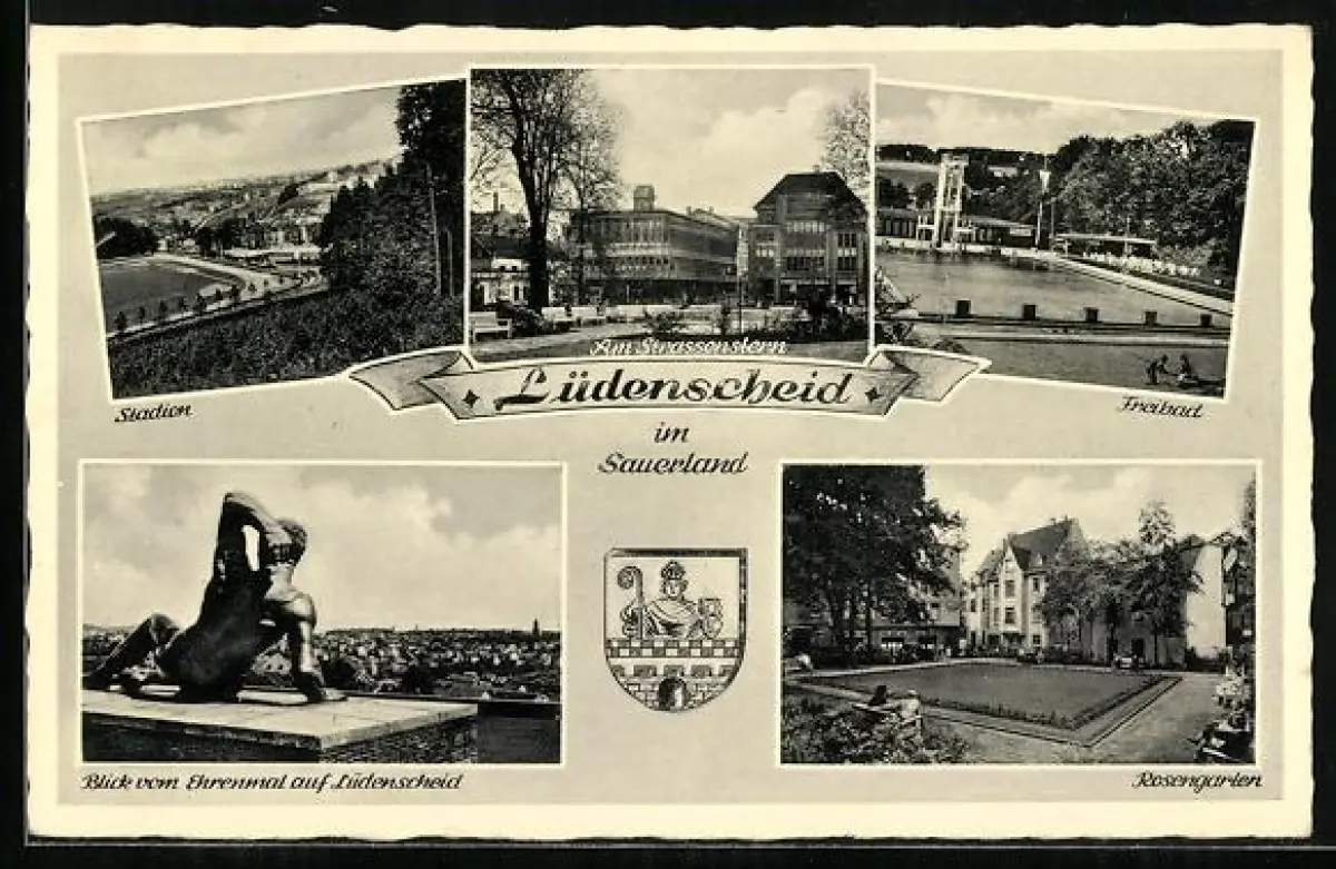 AK Lüdenscheid im Sauerland, Stadion, Strassenstern, Freibad, Rosengarten