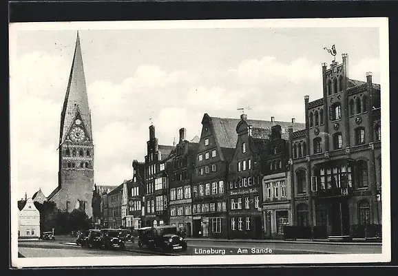AK Lüneburg, Am Sande, Strassenpartie mit Kirche