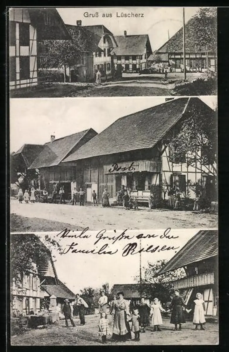 AK Lüscherz, Strassenpartie im Ort, Bewohner vor Gebäuden