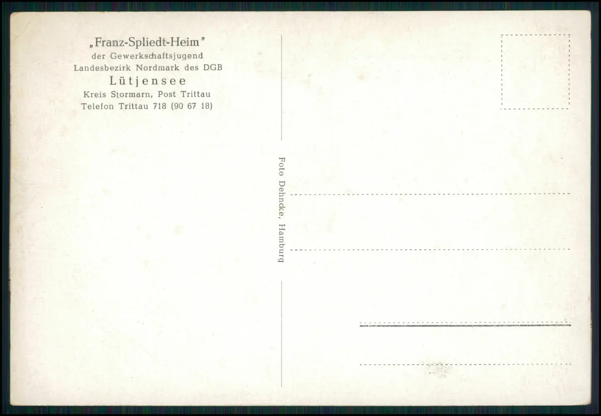 Rückseite: mit Aufdruck „Franz-Spliedt-Heim der Gewerkschaftsjugend Landesbezirk Nordmark des DGB Lütjensee“ und Telefonangabe „Trittau 718“