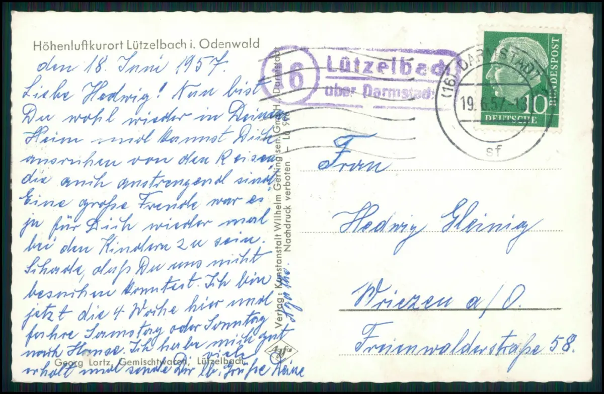 Gelaufen mit Landpoststempel „Lützelbach über Darmstadt“, datiert 18. Juni 1957, frankiert mit 10 Pfennig Heuss-Marke, handschriftlicher Gruß in blauer Tinte, sauberer Postabschlag.