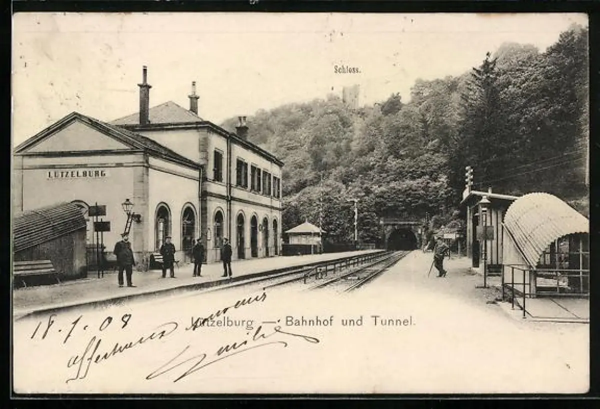 AK Lützelburg, Bahnhof und Tunnel mit Blick zum Schloss