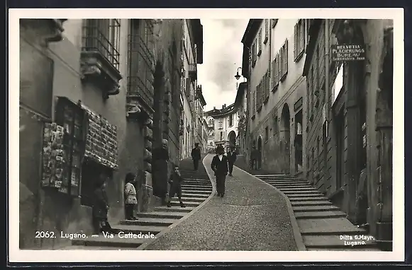 AK Lugano, Via Cattedrale, Strassenpartie mit Passanten