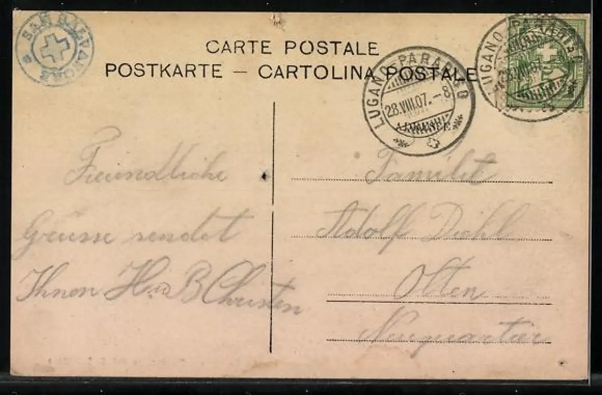 alte Ansichtskarte, gelaufen 1907, Nagelloch Mitte, Einriss oben mittig, Stecknadelloch unten li., guter Zustand