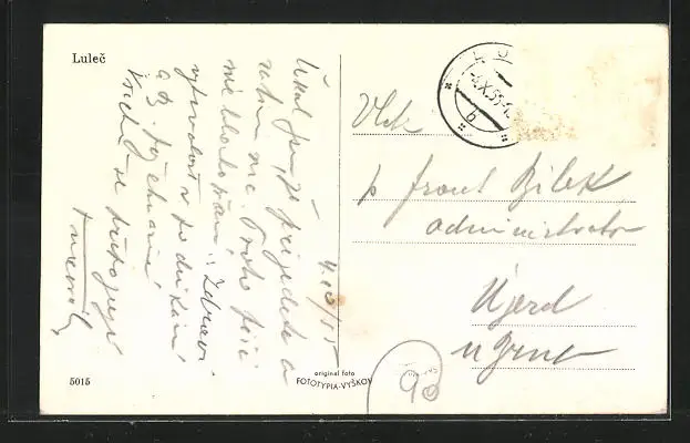 Personenbezogene Daten auf der Rückseite der Karte wurden durch blauen Textmarker unkenntlich gemacht. Die blauen Stellen sind auf die Vorderseite durchgeweicht und wirken sich negativ auf das Postkartenfoto aus