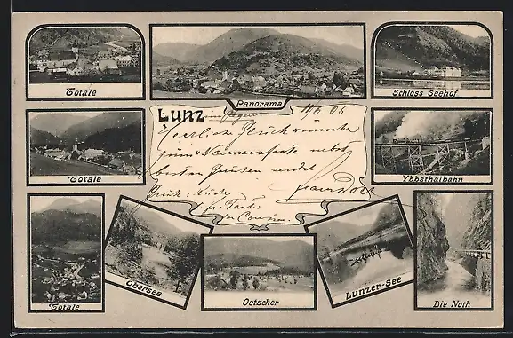 AK Lunz, Totalansicht, Schloss Seehof, Ybbsthalbahn, Die Noth, Lunzer-See, Oetscher, Obersee