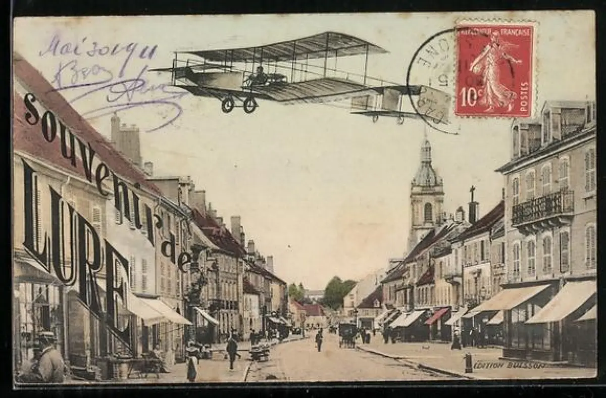 AK Lure, Souvenir de Lure avec avion au-dessus de la rue principale animée
