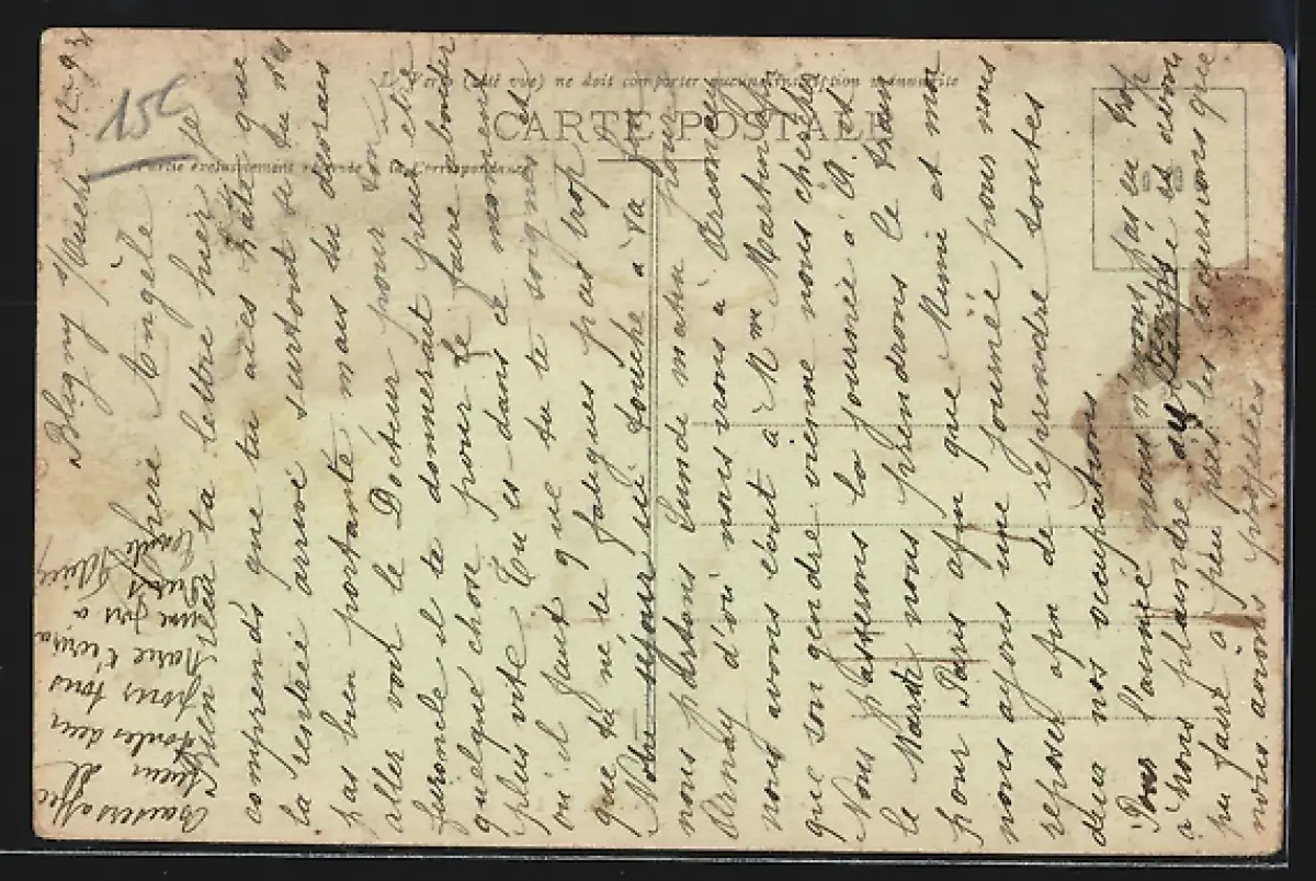 Personenbezogene Daten auf der Rückseite der Karte wurden durch blauen Textmarker unkenntlich gemacht. Die blauen Stellen sind auf die Vorderseite durchgeweicht und wirken sich negativ auf das Postkartenfoto aus