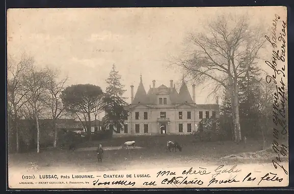 AK Lussac, Château de Lussac avec chevaux dans le parc