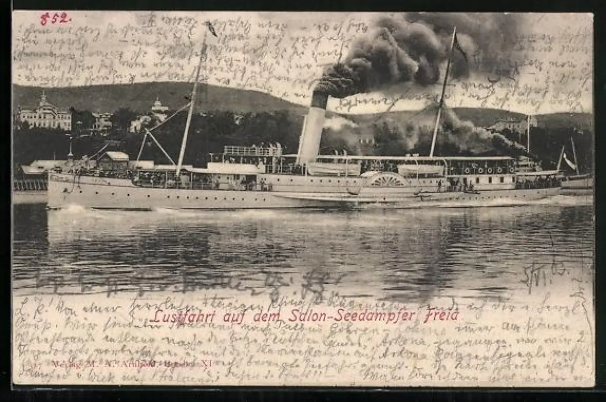 AK Lustfahrt auf dem Salon-Seedampfer Freia, Passagierschiff