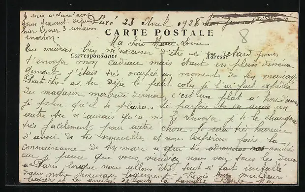Personenbezogene Daten auf der Rückseite der Karte wurden durch blauen Textmarker unkenntlich gemacht. Die blauen Stellen sind auf die Vorderseite durchgeweicht und wirken sich negativ auf das Postkartenfoto aus