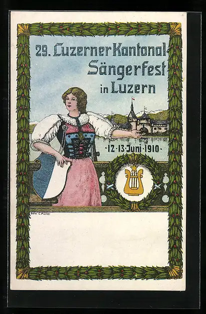 AK Luzern, 29. Luzerner Kantonal Sängerfest 1910, Frau in Tracht mit Wappen zeigt auf den Ort