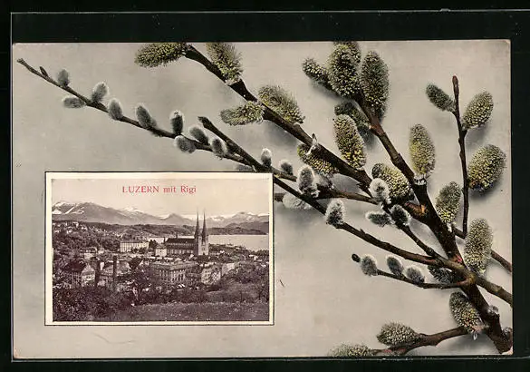 AK Luzern, Ortsansicht mit Rigi, Weidenkätzchen